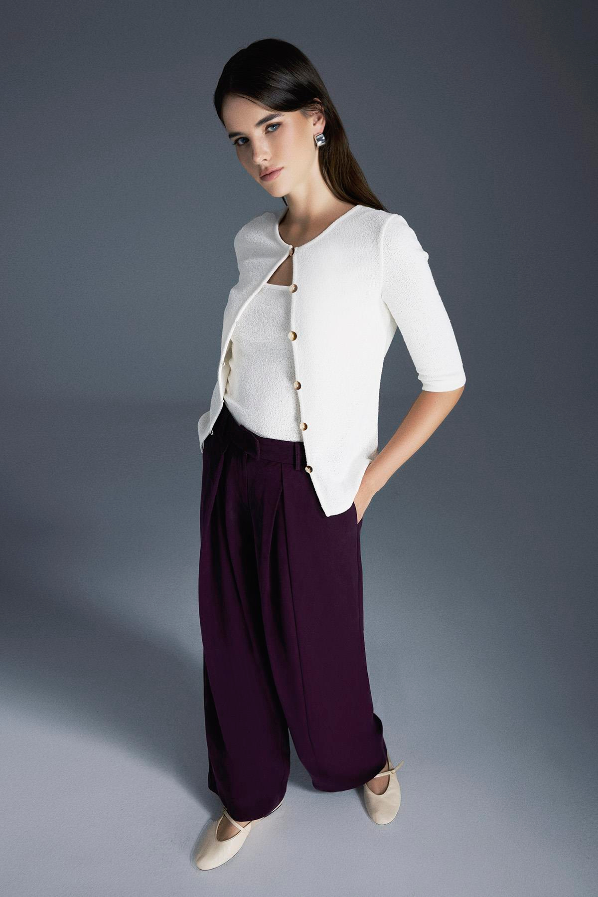 Yumuşak dokulu kumaş kullanılarak üretilmiş , İç askılı bluz dışında ise yarım kollu,Kemik düğme detaylı hırka.