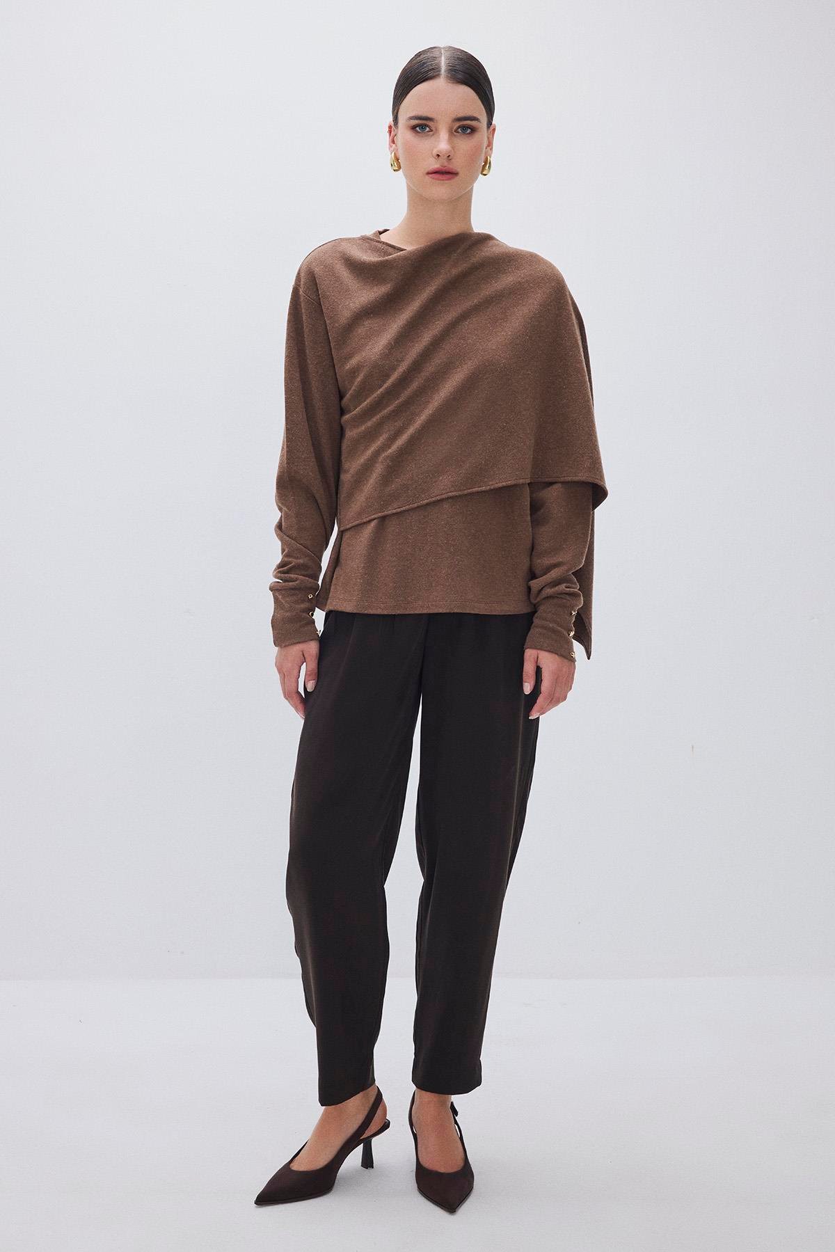 Yumuşak dokulu triko kumaştan üretilmiş, düz kesim ve şal yaka detaya sahip uzun kollu bluzdur.Manşet kısmında küçük gold fonksiyonel olmayan dekoratif gold düğme kullanılmıştır.